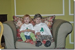 The boys wearing their cute footprint Christmas tree shirts. Jackson wanted to dress like a hunter and when I told him that his pants didn’t match his adorable shirt he immediately went into his room and grabbed the cameo hat that Bruce and Andrew had given him. He returned wearing the hat and smiling and said, “now I match!” Well, who could argue with that? So, he went as a hunter on Christmas Eve. Bear still let’s me dress him so luckily he was wearing plain old jeans.